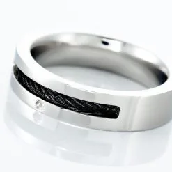 Bague Acier Blanc Diamant Blanc 0.005 Cts Et Cable Noir