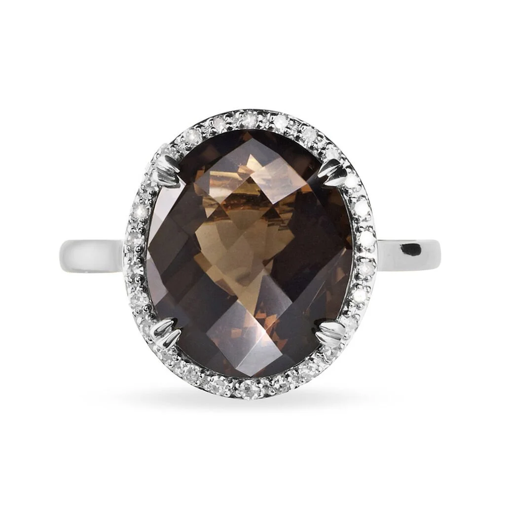 Bague Or Blanc 375/1000 Quartz Fume Ovale Entourage Diamants