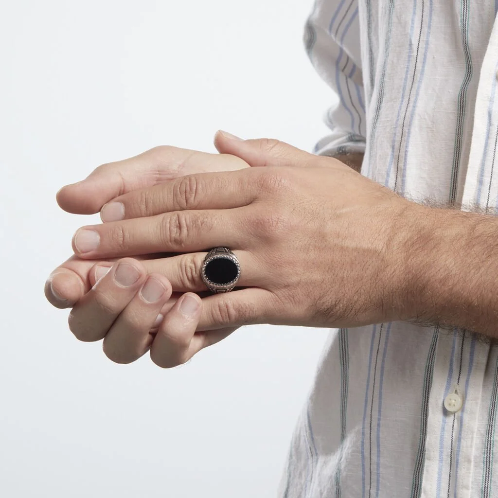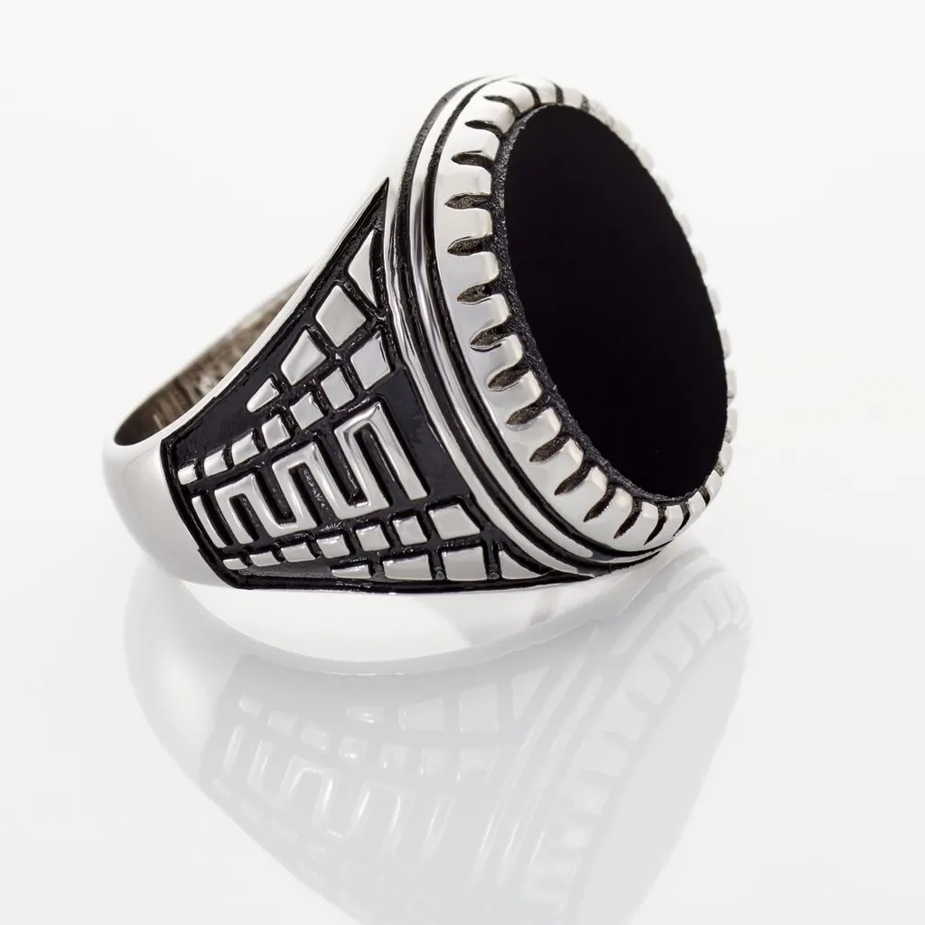 Bague Argent Blanc 925/1000 Agate Noire Corps De Bague Motifs Geometriques Effet Vieilli