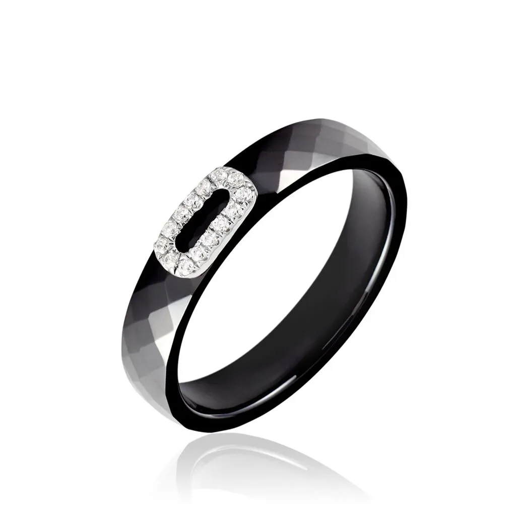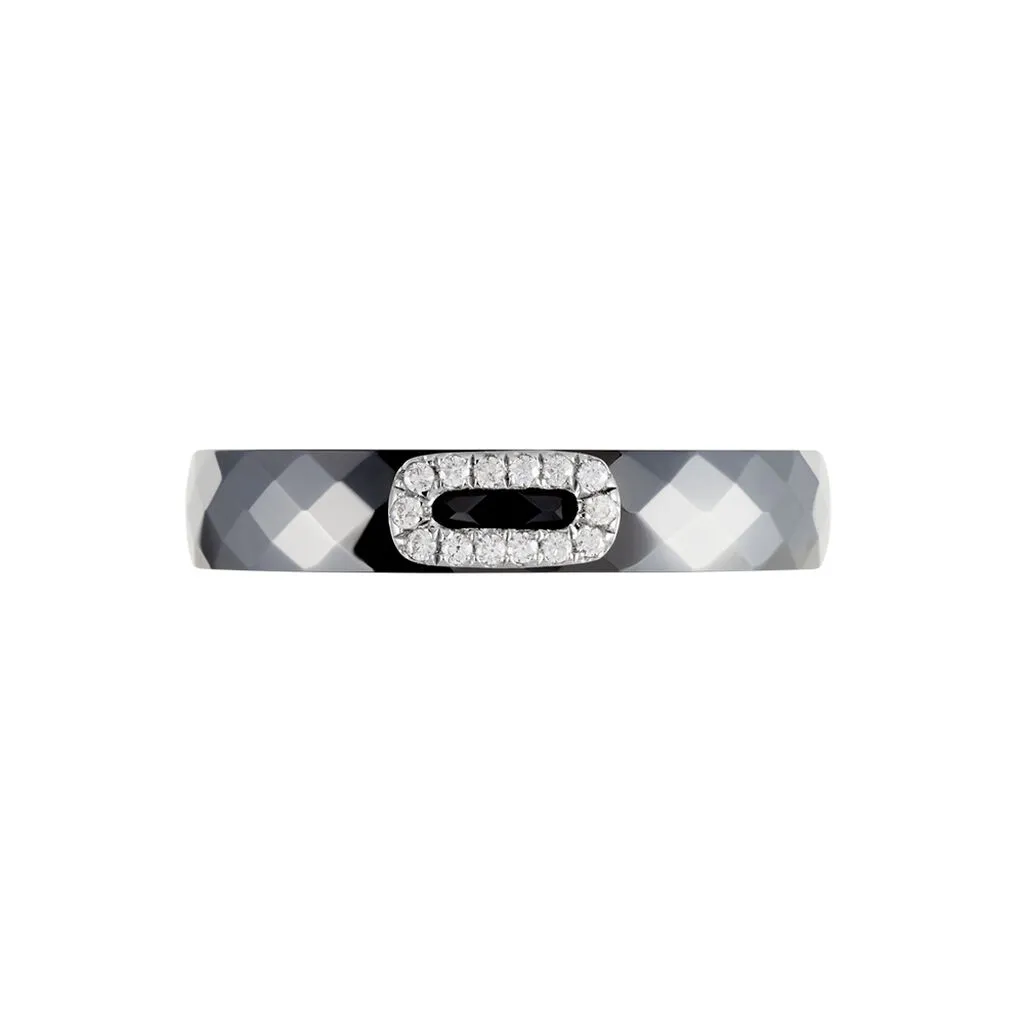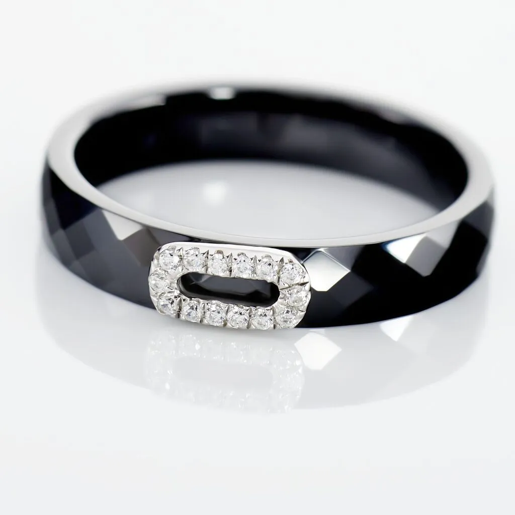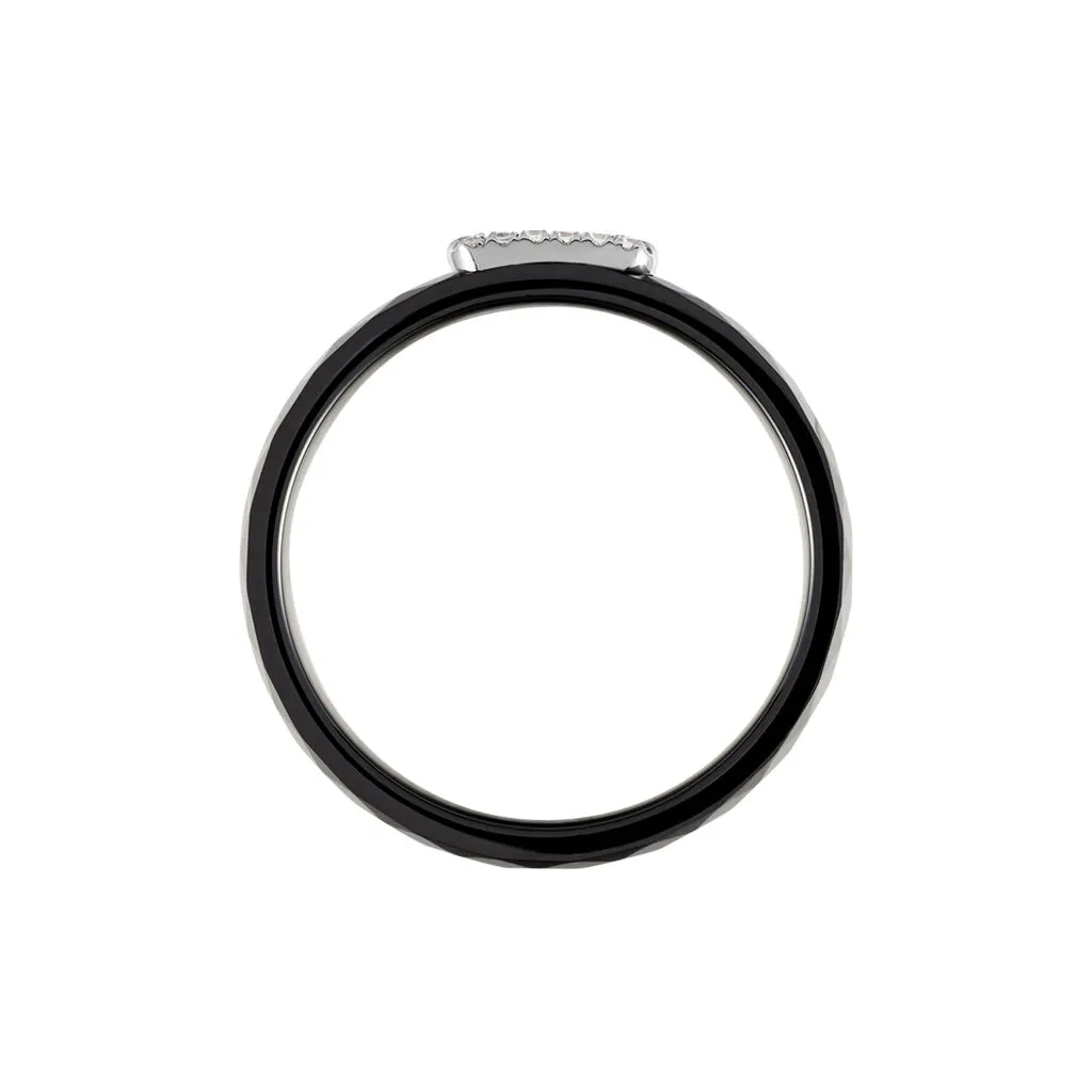 Bague Argent Blanc 925/1000 Et Ceramique Noire Facettee Pavage Oxydes De Zirconium Blancs Forme Arrondie