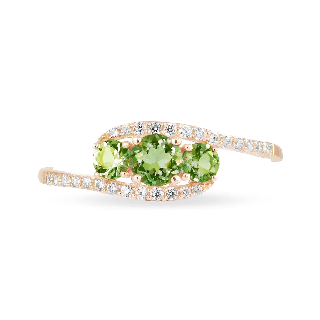 Bague Or Rose 375/1000 Trilogie Péridots Verts 0.64ct Sertis 4 Griffes Et Oxydes De Zirconium