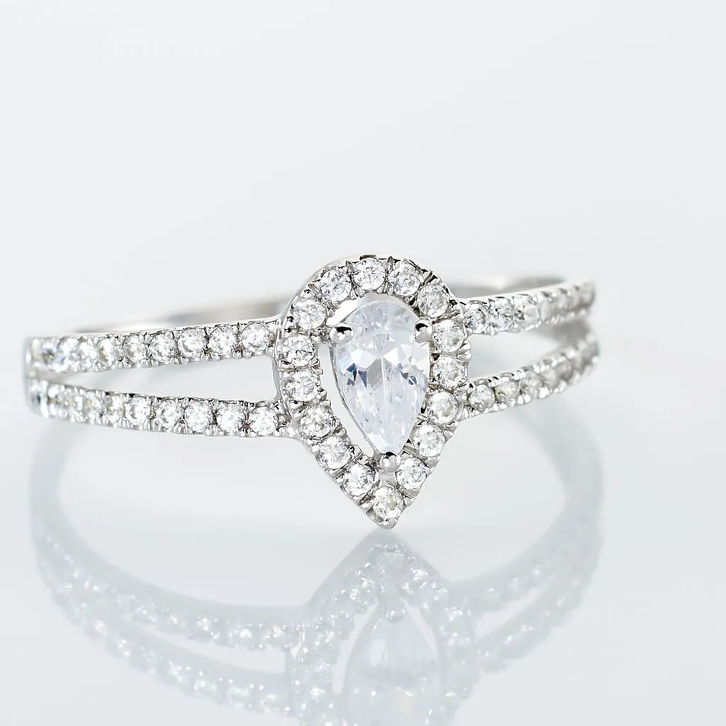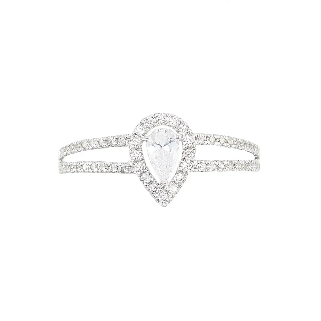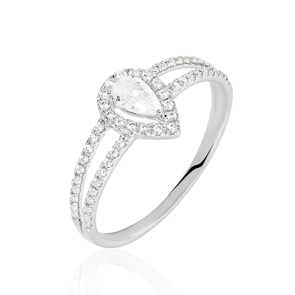 Bague Or Blanc 375/1000 Oxyde De Zirconium Central Forme Poire Accompagne Oxydes De Zirconium