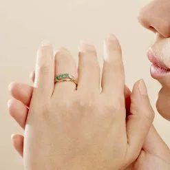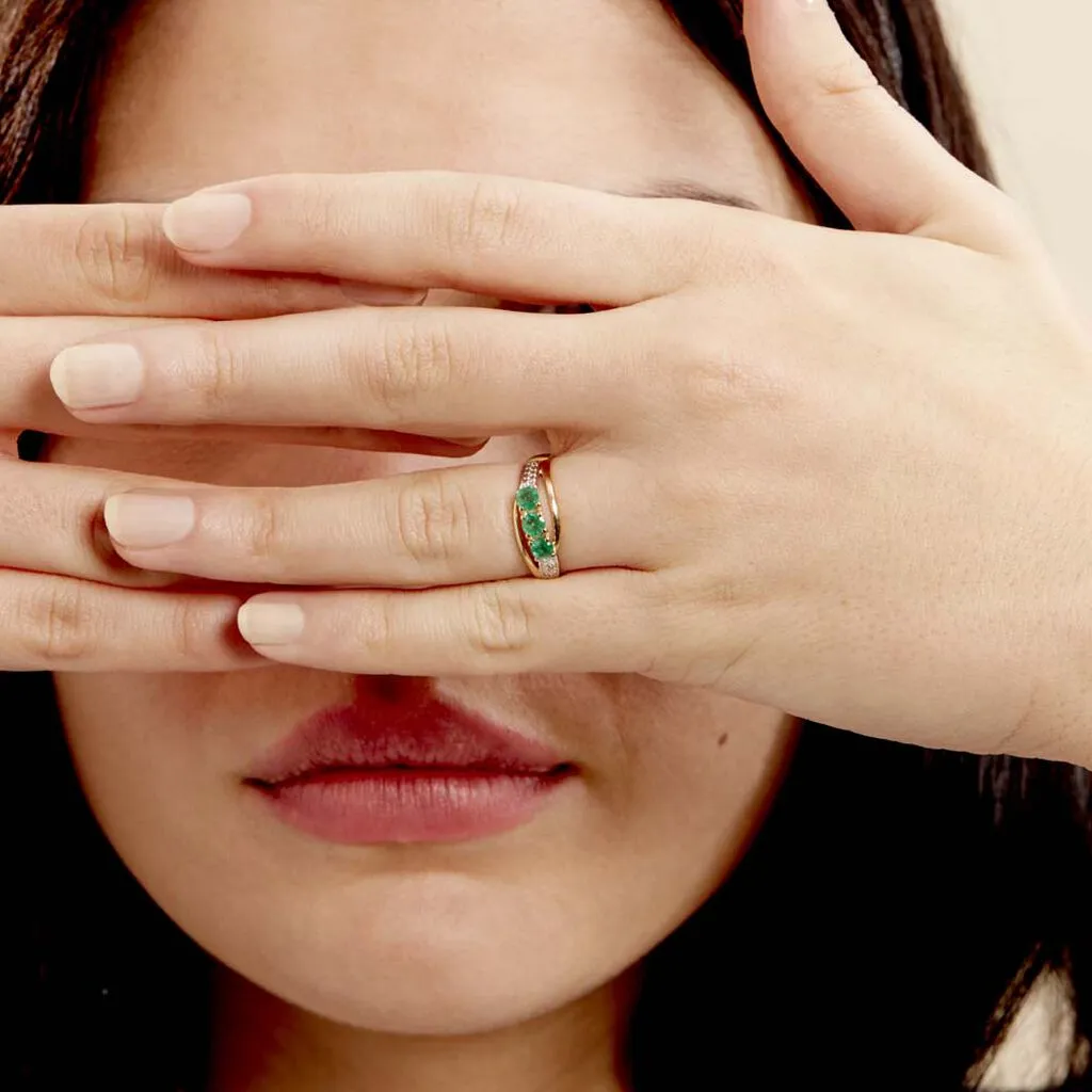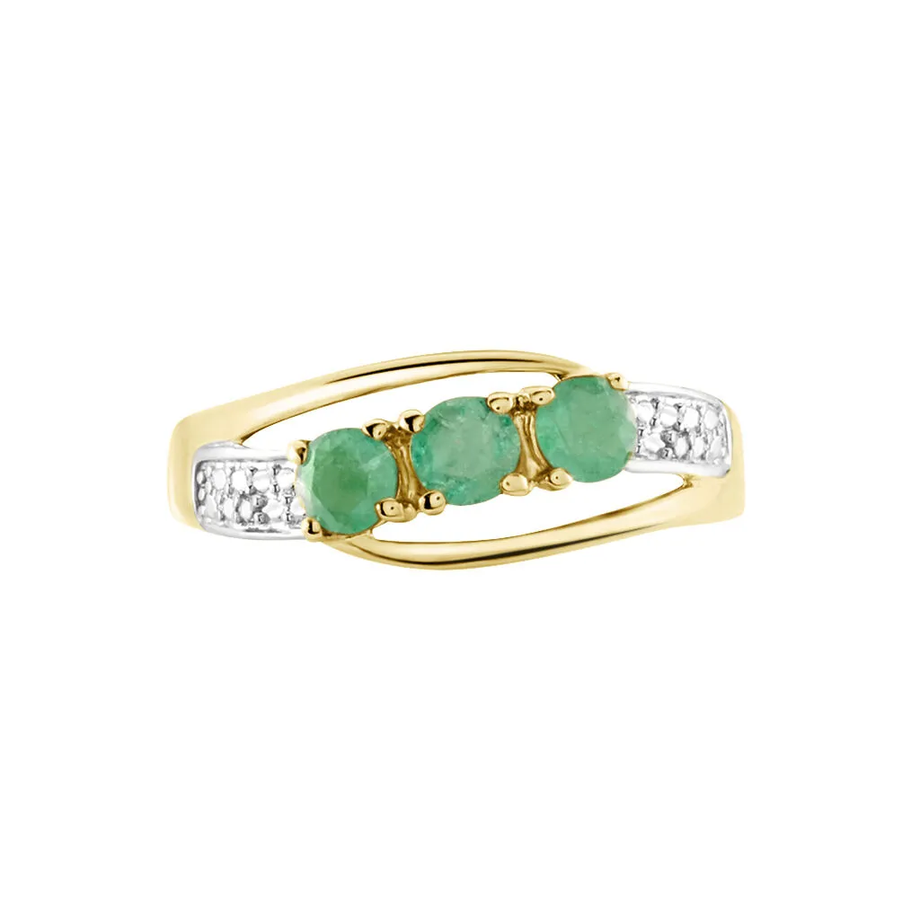 Bague Or Jaune 375/1000 Trilogie 3 Emeraudes Accompagnees Diamants