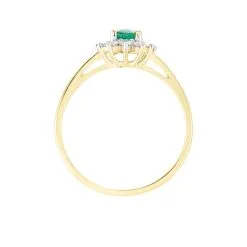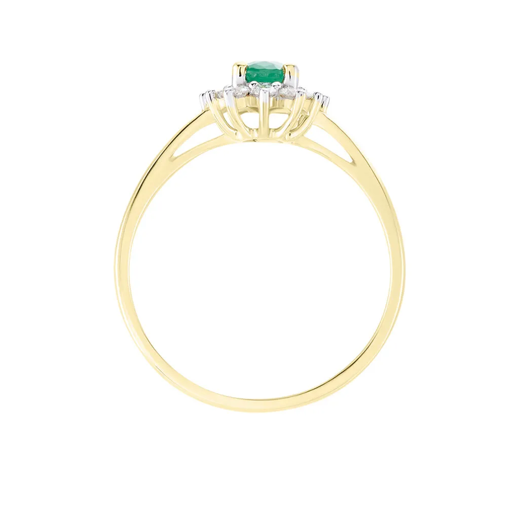 Bague Or Jaune 750/1000 Marguerite Emeraude Oval 0.38 Cts Serti Griffes Entourage Diamants
