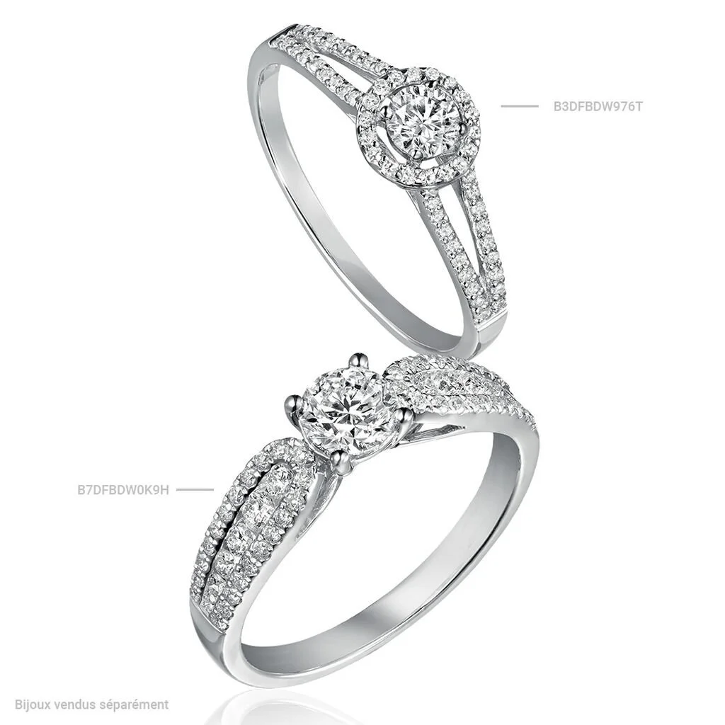 Cette bague raffinée en or blanc complétera vos tenues avec classe. Elle se compose d’un anneau ajouré serti en son centre d’un magnifique diamant. L’entourage et le pavage de diamants blancs sur deux rangs au niveau de son corps font de cette bague un modèle éblouissant.