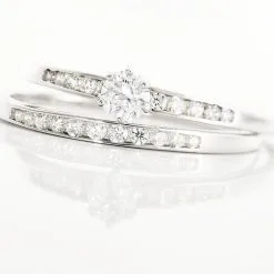 Vous tomberez facilement sous le charme de cet ensemble alliance et bague solitaire en or blanc 375/1000ème. Elles sont chacune incrustées d’oxydes de zirconium blancs sertis rail sur le corps de bague. Le solitaire est rehaussé par une pierre centrale qui lui confère une beauté exceptionnelle.