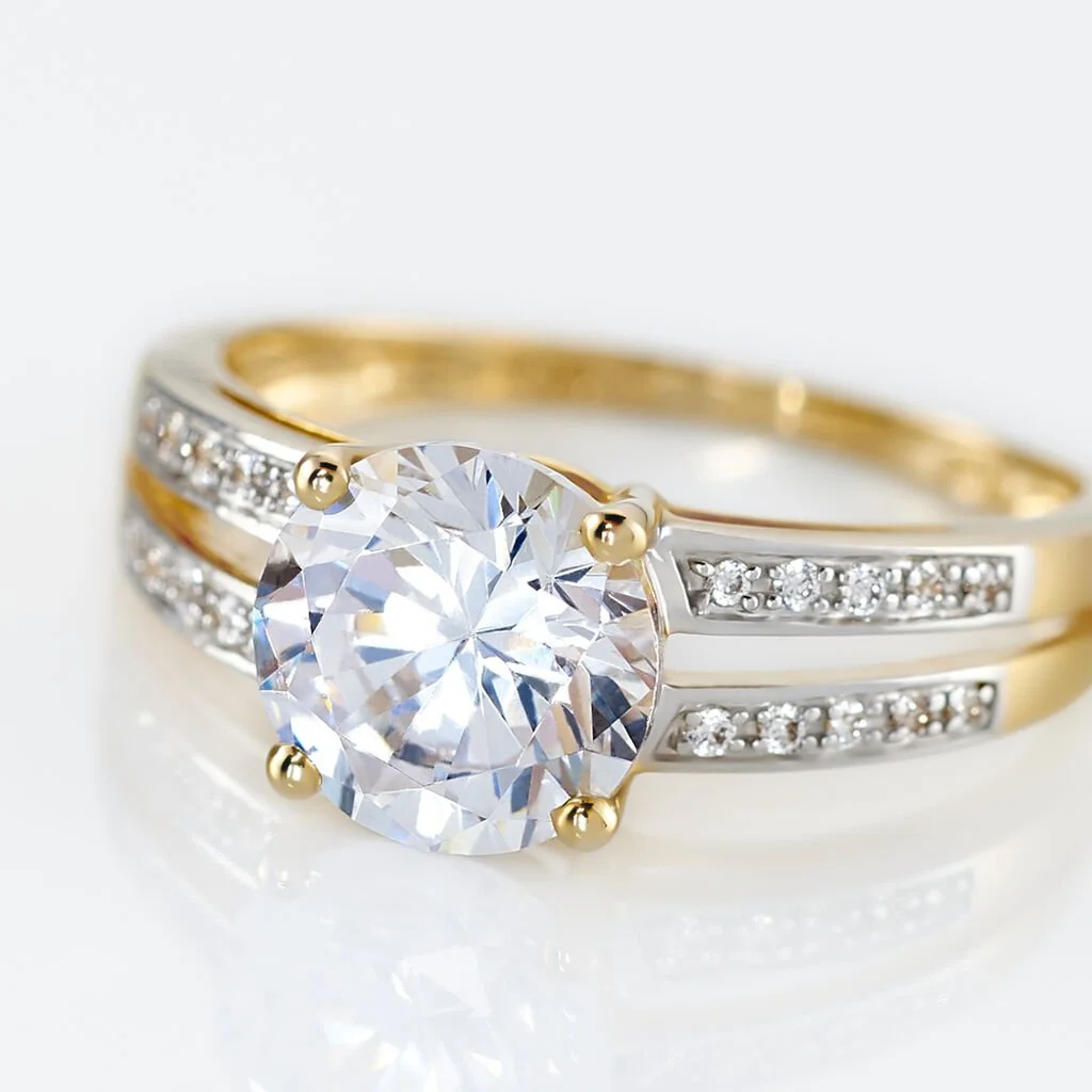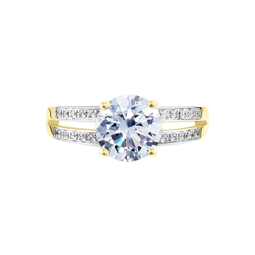 Bague Solitaire Or Jaune 375/1000 Oxyde De Zirconium Central Accompagné Oxydes De Zirconium Double Rang Ajouré
