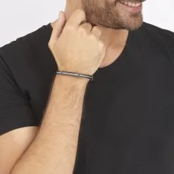 Bracelet Acier Anthony Double Cable Noir Et Fil Coton Gris Central 21cm