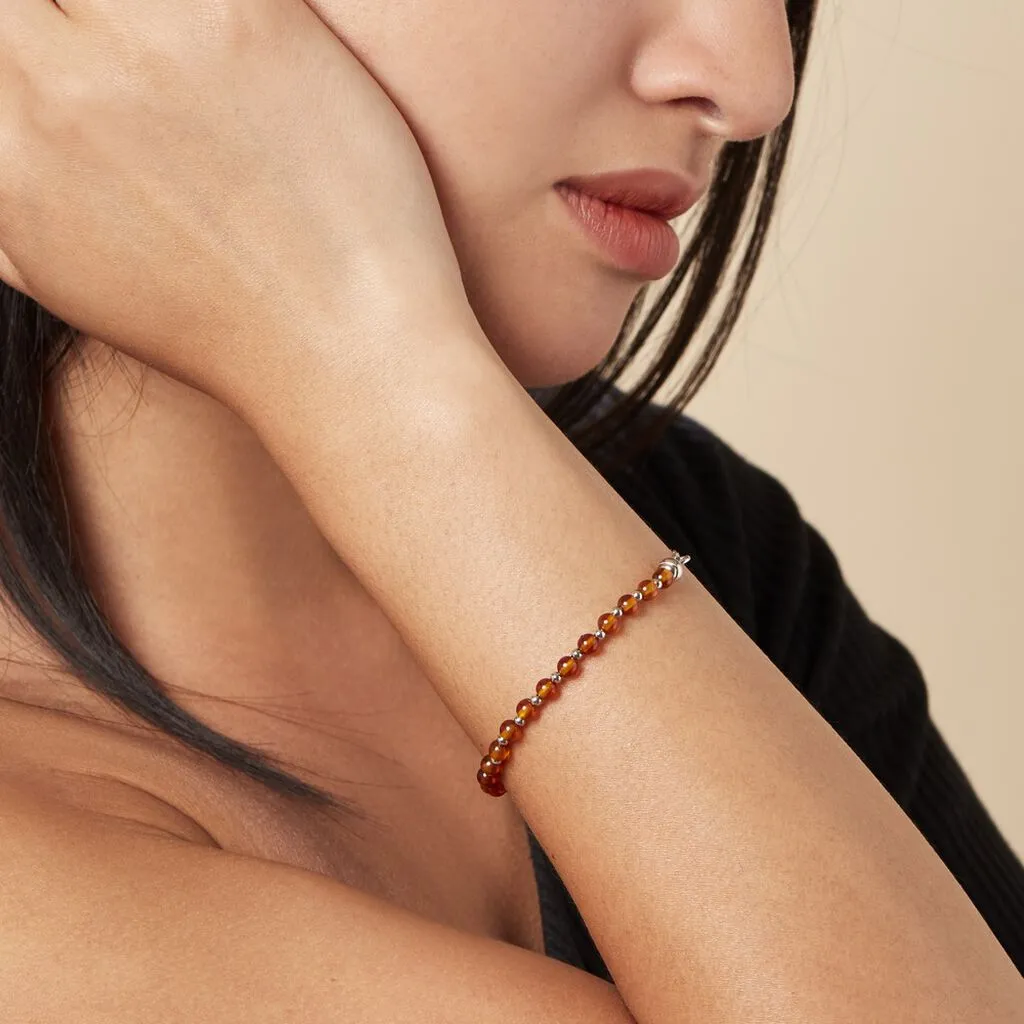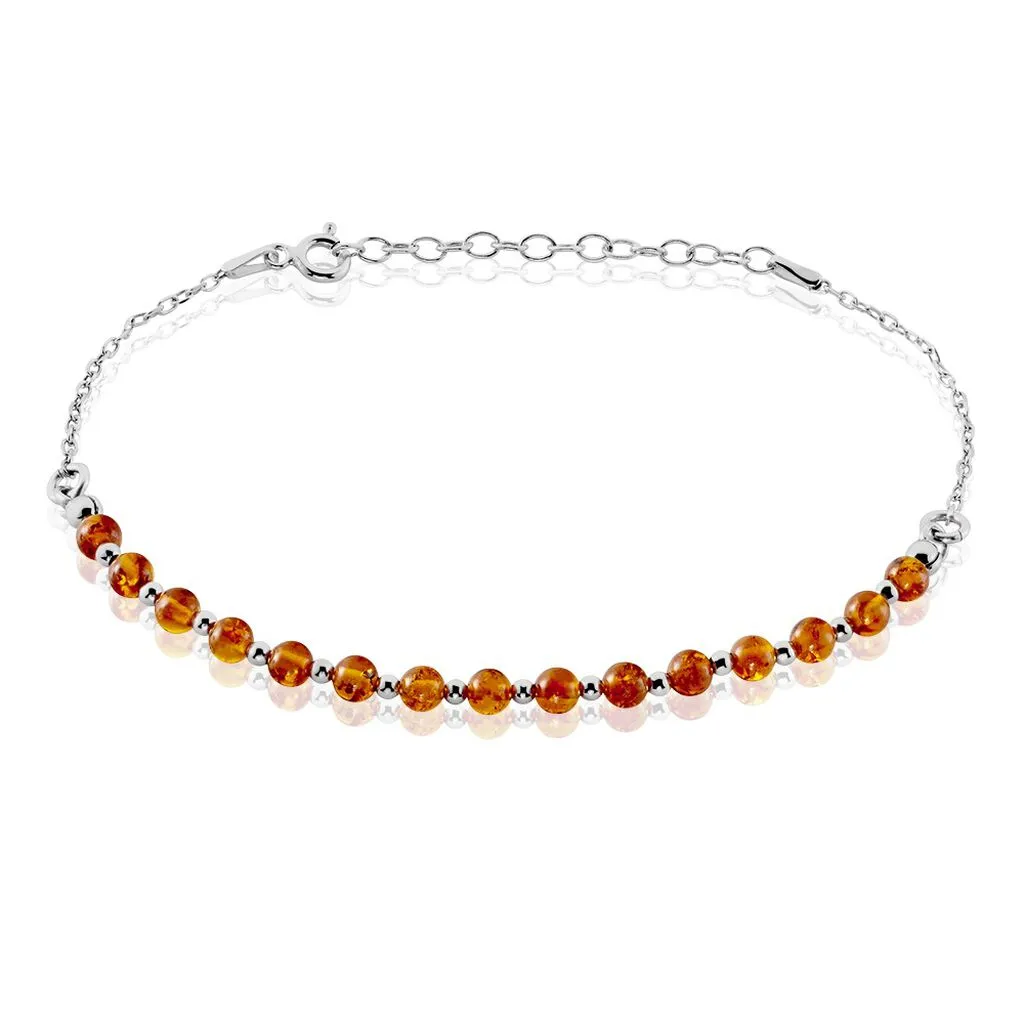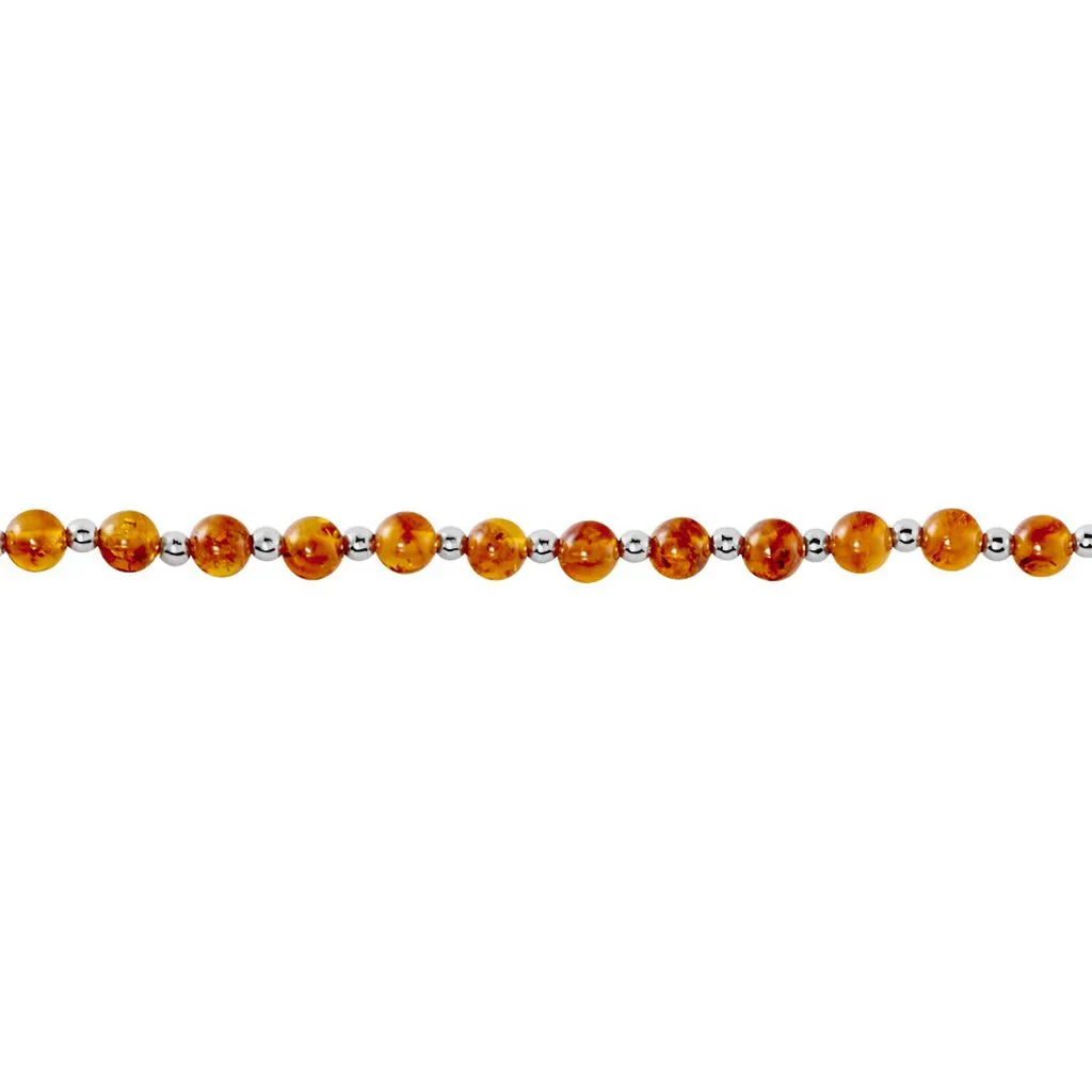 Bracelet Argent Blanc 925/1000 Boules Rondes Ambre Baltique Cognac Maille Forcat 19cm