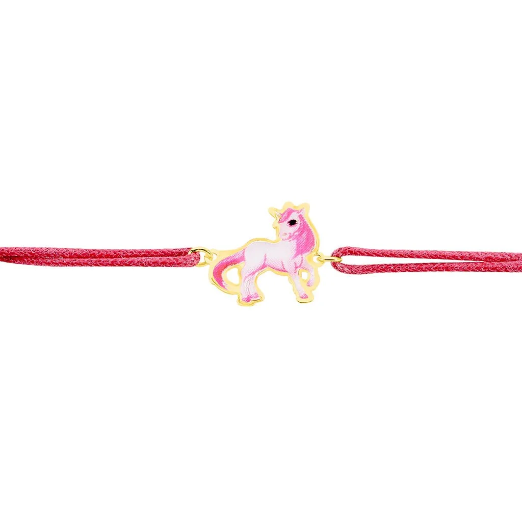 Bracelet Or Jaune 375/1000 Motif Poney Smalto Rose Cordon Rose