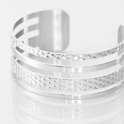 Bracelet Manchette Acier Blanc Ouvert 4 Anneaux Larges Ajoures Alternes Lisses Et Reptile Pm