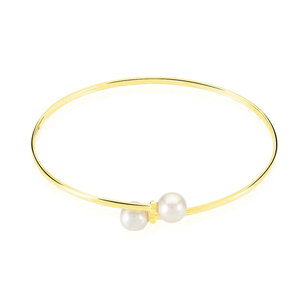 Bracelet Or Jaune 375/1000 Jonc Flexible Avec Double Perles De Culture Blanches