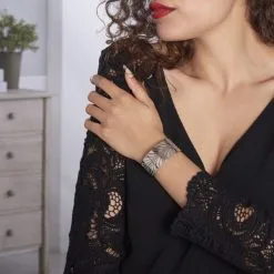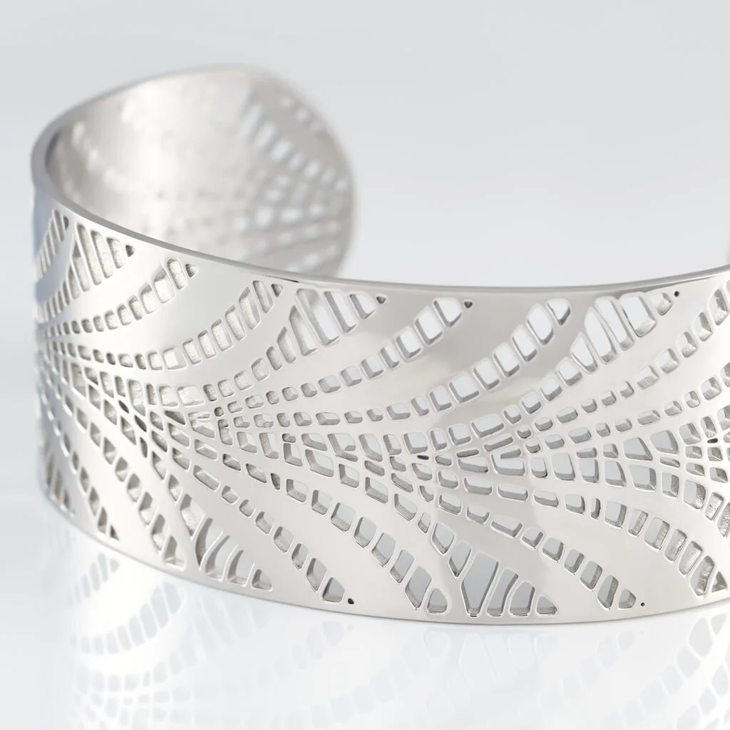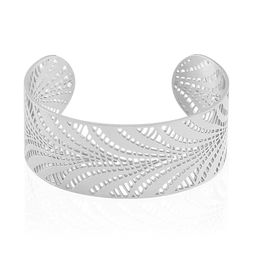 Bracelet Manchette Acier Blanc Ouvert Ajoure Motif Vegetal Diamètre 59*48mm Largeur 25mm