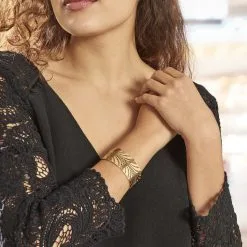 Bracelet Manchette Acier Dore Ouvert Ajoure Motif Vegetal Diamètre 59*48mm Largeur 25mm