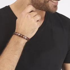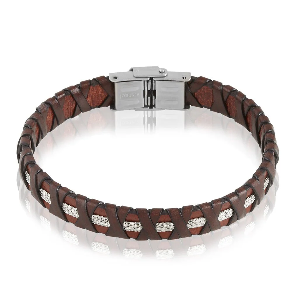 Bracelet Acier Luc Cuir Marron Avec Cable Central 21cm