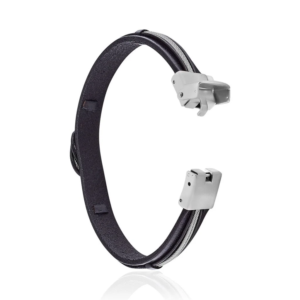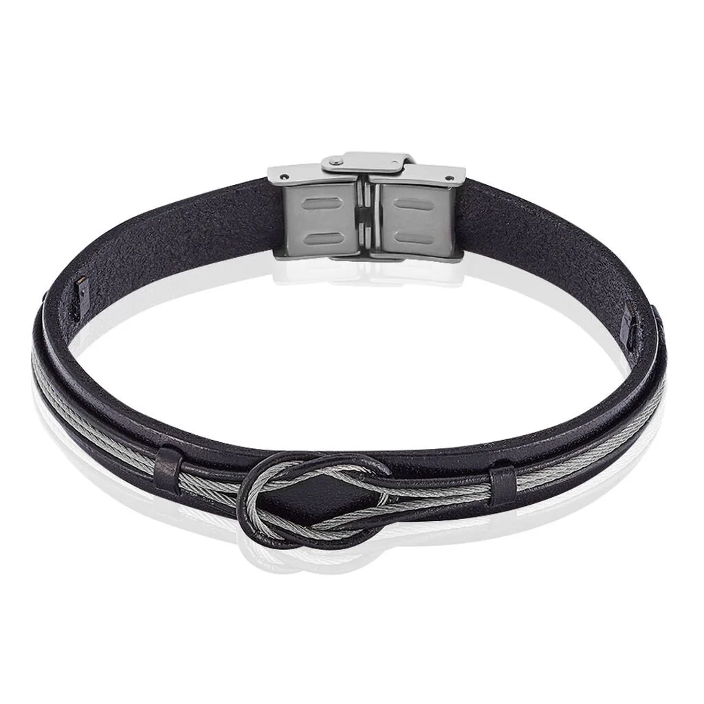 Bracelet Acier Neo Cuir Noir Cable Avec Noeud Marin 21cm