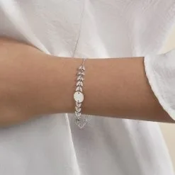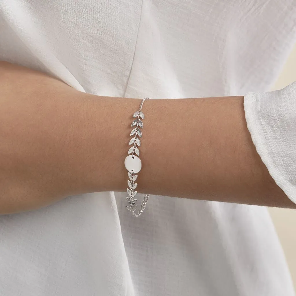 Bracelet Argent Blanc 925/1000 Pastille Centrale Feuilles Articulees Maille Forcat 18cm