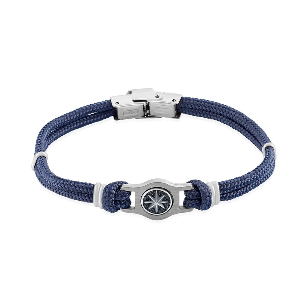 Bracelet Acier Blanc Cordon Bleu Pastille Centrale Motif Rose Des Vents 21cm