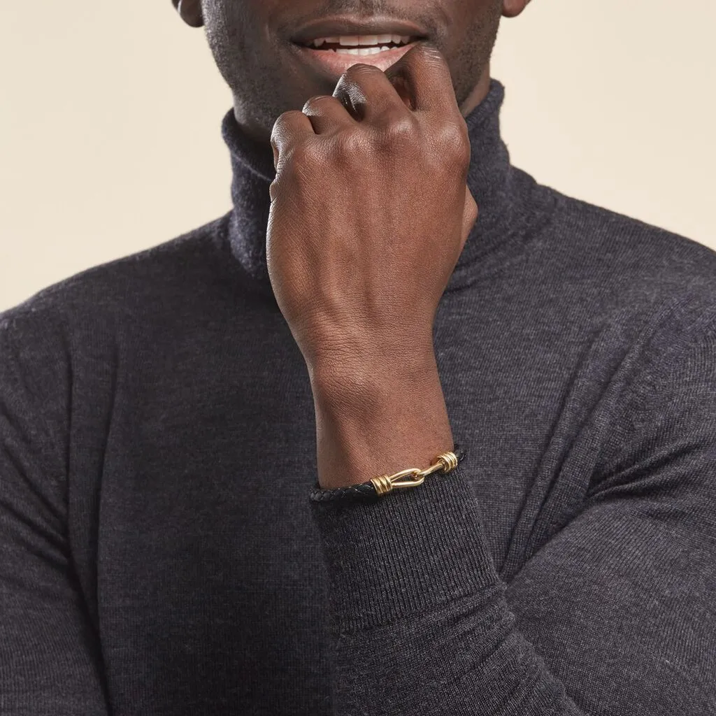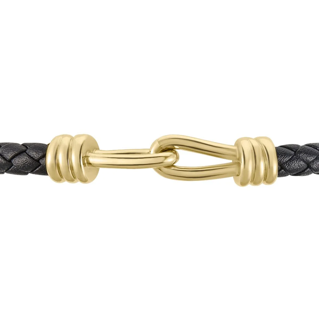 Bracelet Plaque Or Jaune Maillons Entrelaces Cordon Tresse Cuir Noir 21cm