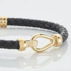 Bracelet Plaque Or Jaune Maillon Cordon Tresse Cuir Noir 21cm