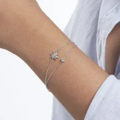 Bracelet Double Chaines Argent Blanc 925/1000 Etoiles Micro Setting Oxydes De Zirconium Maille Forçat 18.5cm