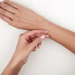 Ce bracelet en argent 925/1000ème révèle votre féminité de manière élégante. Sa maille délicate s’achève par des maillons d’ajustement sur lesquels s’accroche un petit trèfle. Un détail en forme de poire serti d’une pierre de synthèse violette et d’oxydes de zirconium complète merveilleusement ce bracelet. Existe aussi avec une pierre centrale bleue et rose.