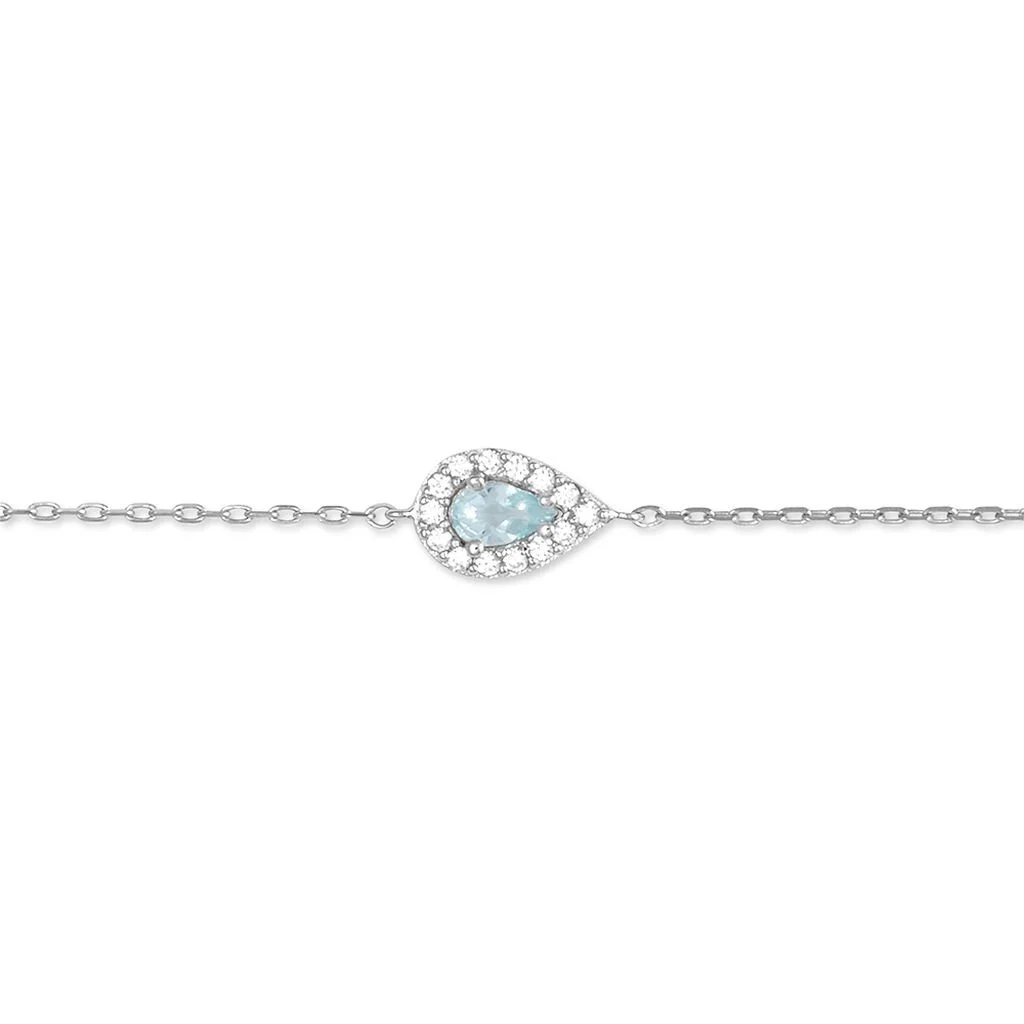 Ce bracelet en argent 925/1000ème complète vos tenues en toutes circonstances. Il est composé d’une chaîne en maille forçat décorée d’une pierre bleue sertie griffes en forme de poire. Un pavage d’oxyde de zirconium entoure cette dernière. Le bracelet dispose d’un fermoir anneau ressort ajustable. Il existe aussi en d’autres couleurs.