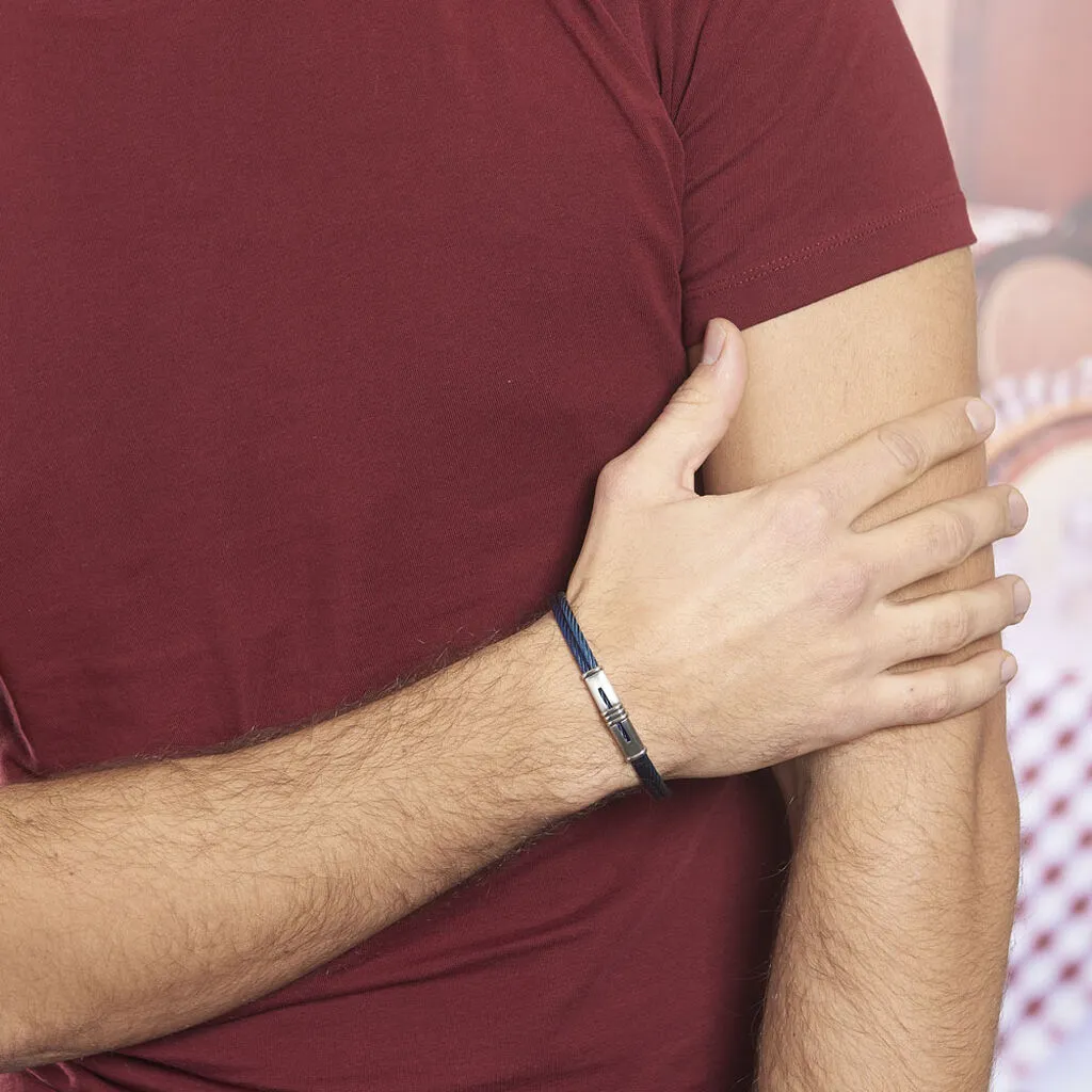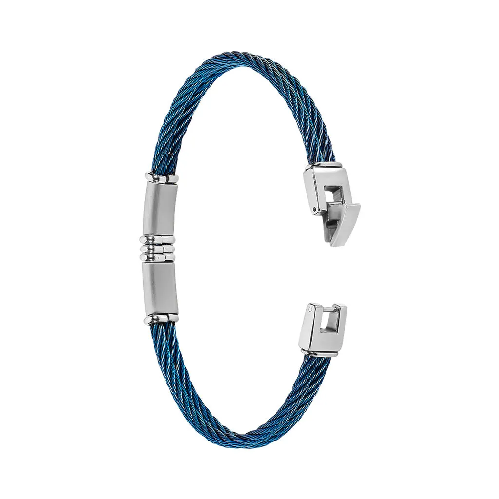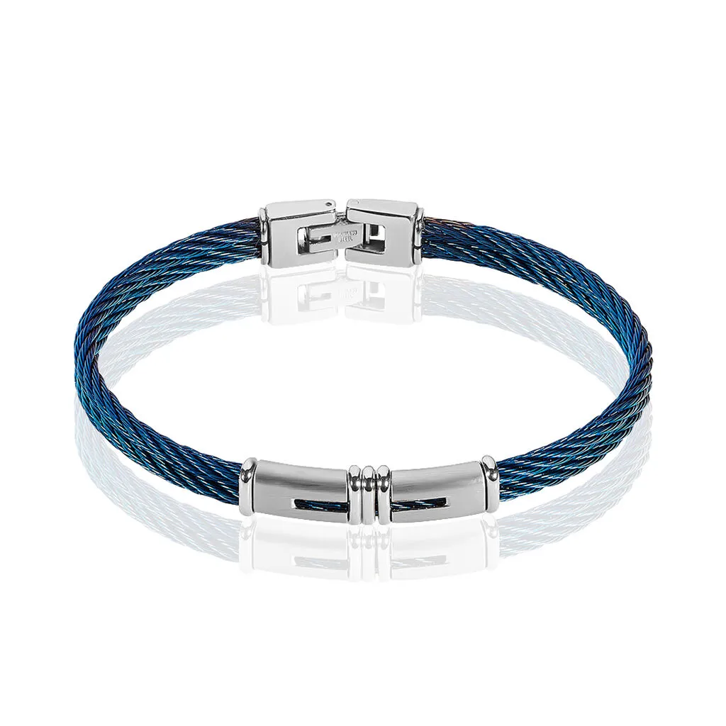 Bracelet Acier Victor Double Cables Bleus Barette Acier 21cm
