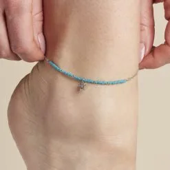 Chaîne De Cheville Argent Blanc 925/1000 Pampille Etoile De Mer Perles De Miyuki Bleues Et Boules Argent Maille Forçat 25cm